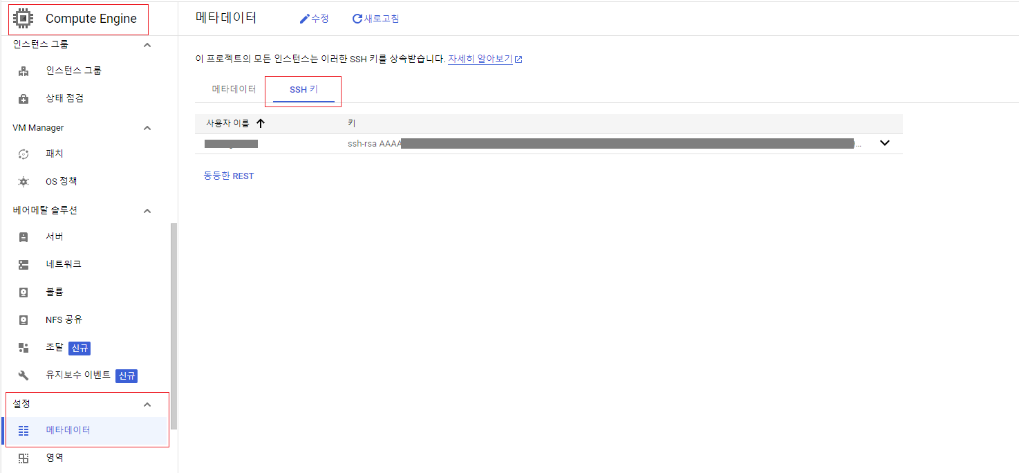 GCP 콘솔의 Compute engine > 설정 > 메타데이터 항목에서 SSH키에 추가를 해줍니다.